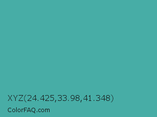 XYZ 24.425,33.98,41.348 Color is a normal cyan color and the nearest color is Verdigris #43b3ae. Hex code #47ada6 and RGB value is rgb(71,173,166). In RGB color space, this color is composed of 28% red, 68% green, 65% blue, In CMYK color space, this color is composed of 59% cyan, 0% magenta, 4% yellow , 32% black , In HSL color space, this color has a hue angle of 176° , 42% saturation and 48% lightness.