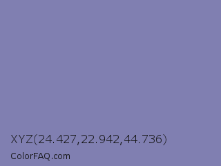 XYZ 24.427,22.942,44.736 Color is a normal indigo color and the nearest color is Wild Blue Yonder #7a89b8. Hex code #807fb1 and RGB value is rgb(128,127,177). In RGB color space, this color is composed of 50% red, 50% green, 69% blue, In CMYK color space, this color is composed of 28% cyan, 28% magenta, 0% yellow , 31% black , In HSL color space, this color has a hue angle of 241° , 24% saturation and 60% lightness.