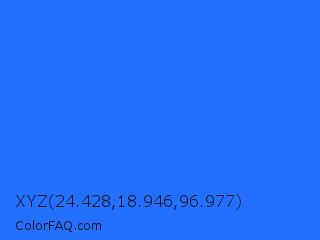 XYZ 24.428,18.946,96.977 Color is a normal blue color and the nearest color is Blue Crayola #1f75fe. Hex code #236fff and RGB value is rgb(35,111,255). In RGB color space, this color is composed of 14% red, 44% green, 100% blue, In CMYK color space, this color is composed of 86% cyan, 56% magenta, 0% yellow , 0% black , In HSL color space, this color has a hue angle of 219° , 100% saturation and 57% lightness.
