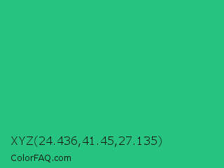 XYZ 24.436,41.45,27.135 Color is a normal green color and the nearest color is Mountain Meadow #30ba8f. Hex code #26c480 and RGB value is rgb(38,196,128). In RGB color space, this color is composed of 15% red, 77% green, 50% blue, In CMYK color space, this color is composed of 81% cyan, 0% magenta, 35% yellow , 23% black , In HSL color space, this color has a hue angle of 154° , 68% saturation and 46% lightness.