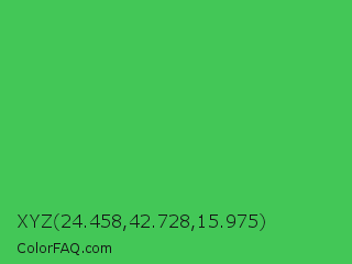 XYZ 24.458,42.728,15.975 Color is a normal green color and the nearest color is UFO Green #3cd070. Hex code #43c757 and RGB value is rgb(67,199,87). In RGB color space, this color is composed of 26% red, 78% green, 34% blue, In CMYK color space, this color is composed of 66% cyan, 0% magenta, 56% yellow , 22% black , In HSL color space, this color has a hue angle of 129° , 54% saturation and 52% lightness.
