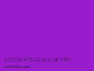 XYZ 24.475,12.011,58.155 Color is a normal purple color and the nearest color is Dark Orchid #9932cc. Hex code #991dcc and RGB value is rgb(153,29,204). In RGB color space, this color is composed of 60% red, 11% green, 80% blue, In CMYK color space, this color is composed of 25% cyan, 86% magenta, 0% yellow , 20% black , In HSL color space, this color has a hue angle of 283° , 75% saturation and 46% lightness.