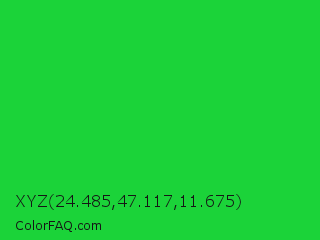 XYZ 24.485,47.117,11.675 Color is a normal green color and the nearest color is Lime Green #32cd32. Hex code #1bd339 and RGB value is rgb(27,211,57). In RGB color space, this color is composed of 11% red, 83% green, 22% blue, In CMYK color space, this color is composed of 87% cyan, 0% magenta, 73% yellow , 17% black , In HSL color space, this color has a hue angle of 130° , 77% saturation and 47% lightness.