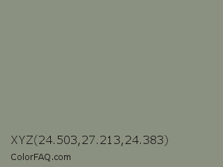 XYZ 24.503,27.213,24.383 Color is a normal green color and the nearest color is Dolphin Gray #828e84. Hex code #8a9180 and RGB value is rgb(138,145,128). In RGB color space, this color is composed of 54% red, 57% green, 50% blue, In CMYK color space, this color is composed of 5% cyan, 0% magenta, 12% yellow , 43% black , In HSL color space, this color has a hue angle of 85° , 7% saturation and 54% lightness.