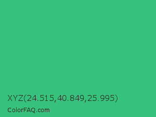 XYZ 24.515,40.849,25.995 Color is a normal green color and the nearest color is UFO Green #3cd070. Hex code #36c27d and RGB value is rgb(54,194,125). In RGB color space, this color is composed of 21% red, 76% green, 49% blue, In CMYK color space, this color is composed of 72% cyan, 0% magenta, 36% yellow , 24% black , In HSL color space, this color has a hue angle of 150° , 56% saturation and 49% lightness.