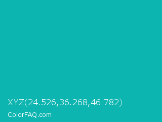 XYZ 24.526,36.268,46.782 Color is a normal cyan color and the nearest color is Tiffany Blue #0abab5. Hex code #0db5b0 and RGB value is rgb(13,181,176). In RGB color space, this color is composed of 5% red, 71% green, 69% blue, In CMYK color space, this color is composed of 93% cyan, 0% magenta, 3% yellow , 29% black , In HSL color space, this color has a hue angle of 178° , 87% saturation and 38% lightness.