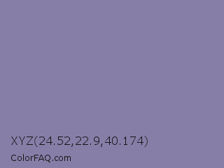 XYZ 24.52,22.9,40.174 Color is a normal indigo color and the nearest color is Manatee Crayola #8d90a1. Hex code #877ea8 and RGB value is rgb(135,126,168). In RGB color space, this color is composed of 53% red, 49% green, 66% blue, In CMYK color space, this color is composed of 20% cyan, 25% magenta, 0% yellow , 34% black , In HSL color space, this color has a hue angle of 253° , 19% saturation and 58% lightness.