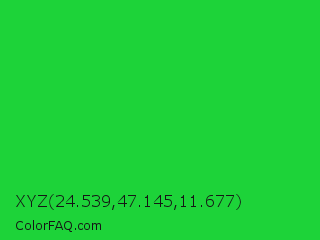 XYZ 24.539,47.145,11.677 Color is a normal green color and the nearest color is Lime Green #32cd32. Hex code #1dd339 and RGB value is rgb(29,211,57). In RGB color space, this color is composed of 11% red, 83% green, 22% blue, In CMYK color space, this color is composed of 86% cyan, 0% magenta, 73% yellow , 17% black , In HSL color space, this color has a hue angle of 129° , 76% saturation and 47% lightness.