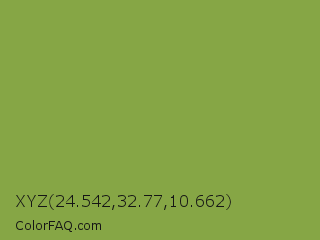 XYZ 24.542,32.77,10.662 Color is a normal green color and the nearest color is Sushi #87ab39. Hex code #86a645 and RGB value is rgb(134,166,69). In RGB color space, this color is composed of 53% red, 65% green, 27% blue, In CMYK color space, this color is composed of 19% cyan, 0% magenta, 58% yellow , 35% black , In HSL color space, this color has a hue angle of 80° , 41% saturation and 46% lightness.