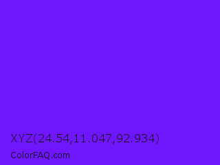 XYZ 24.54,11.047,92.934 Color is a normal violet color and the nearest color is Electric Indigo #6f00ff. Hex code #7016fc and RGB value is rgb(112,22,252). In RGB color space, this color is composed of 44% red, 9% green, 99% blue, In CMYK color space, this color is composed of 56% cyan, 91% magenta, 0% yellow , 1% black , In HSL color space, this color has a hue angle of 263° , 97% saturation and 54% lightness.