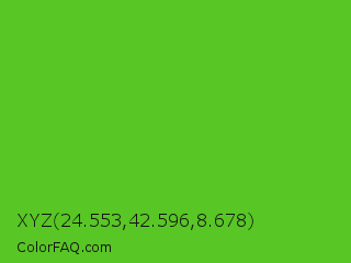XYZ 24.553,42.596,8.678 Color is a normal green color and the nearest color is Kelly Green #4cbb17. Hex code #58c625 and RGB value is rgb(88,198,37). In RGB color space, this color is composed of 35% red, 78% green, 15% blue, In CMYK color space, this color is composed of 56% cyan, 0% magenta, 81% yellow , 22% black , In HSL color space, this color has a hue angle of 101° , 69% saturation and 46% lightness.