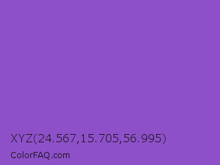 XYZ 24.567,15.705,56.995 Color is a normal purple color and the nearest color is Deep Lilac #9955bb. Hex code #8e50c9 and RGB value is rgb(142,80,201). In RGB color space, this color is composed of 56% red, 31% green, 79% blue, In CMYK color space, this color is composed of 29% cyan, 60% magenta, 0% yellow , 21% black , In HSL color space, this color has a hue angle of 271° , 53% saturation and 55% lightness.