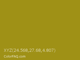 XYZ 24.568,27.68,4.807 Color is a normal yellow color and the nearest color is Dark Yellow #9b870c. Hex code #9f9116 and RGB value is rgb(159,145,22). In RGB color space, this color is composed of 62% red, 57% green, 9% blue, In CMYK color space, this color is composed of 0% cyan, 9% magenta, 86% yellow , 38% black , In HSL color space, this color has a hue angle of 54° , 76% saturation and 35% lightness.
