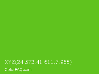 XYZ 24.573,41.611,7.965 Color is a normal green color and the nearest color is Kelly Green #4cbb17. Hex code #60c31e and RGB value is rgb(96,195,30). In RGB color space, this color is composed of 38% red, 76% green, 12% blue, In CMYK color space, this color is composed of 51% cyan, 0% magenta, 85% yellow , 24% black , In HSL color space, this color has a hue angle of 96° , 73% saturation and 44% lightness.