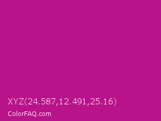 XYZ 24.587,12.491,25.16 Color is a normal magenta color and the nearest color is Red Violet #c71585. Hex code #b8138a and RGB value is rgb(184,19,138). In RGB color space, this color is composed of 72% red, 7% green, 54% blue, In CMYK color space, this color is composed of 0% cyan, 90% magenta, 25% yellow , 28% black , In HSL color space, this color has a hue angle of 317° , 81% saturation and 40% lightness.