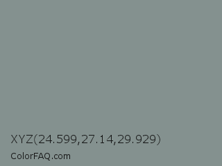 XYZ 24.599,27.14,29.929 Color is a normal cyan color and the nearest color is Oslo Gray #878d91. Hex code #84918f and RGB value is rgb(132,145,143). In RGB color space, this color is composed of 52% red, 57% green, 56% blue, In CMYK color space, this color is composed of 9% cyan, 0% magenta, 1% yellow , 43% black , In HSL color space, this color has a hue angle of 171° , 6% saturation and 54% lightness.