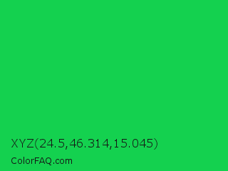 XYZ 24.5,46.314,15.045 Color is a normal green color and the nearest color is Malachite #0bda51. Hex code #14d14f and RGB value is rgb(20,209,79). In RGB color space, this color is composed of 8% red, 82% green, 31% blue, In CMYK color space, this color is composed of 90% cyan, 0% magenta, 62% yellow , 18% black , In HSL color space, this color has a hue angle of 139° , 83% saturation and 45% lightness.