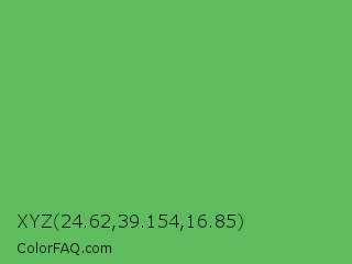 XYZ 24.62,39.154,16.85 Color is a normal green color and the nearest color is Fern #63b76c. Hex code #5ebc5e and RGB value is rgb(94,188,94). In RGB color space, this color is composed of 37% red, 74% green, 37% blue, In CMYK color space, this color is composed of 50% cyan, 0% magenta, 50% yellow , 26% black , In HSL color space, this color has a hue angle of 120° , 41% saturation and 55% lightness.