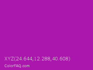 XYZ 24.644,12.288,40.608 Color is a normal magenta color and the nearest color is Heliotrope Magenta #aa00bb. Hex code #ab17ad and RGB value is rgb(171,23,173). In RGB color space, this color is composed of 67% red, 9% green, 68% blue, In CMYK color space, this color is composed of 1% cyan, 87% magenta, 0% yellow , 32% black , In HSL color space, this color has a hue angle of 299° , 77% saturation and 38% lightness.