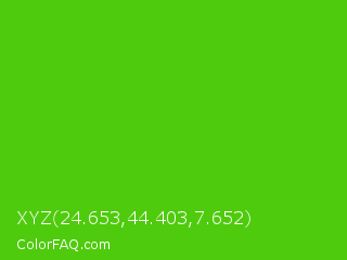 XYZ 24.653,44.403,7.652 Color is a normal green color and the nearest color is Harlequin Green #46cb18. Hex code #4fcb0d and RGB value is rgb(79,203,13). In RGB color space, this color is composed of 31% red, 80% green, 5% blue, In CMYK color space, this color is composed of 61% cyan, 0% magenta, 94% yellow , 20% black , In HSL color space, this color has a hue angle of 99° , 88% saturation and 42% lightness.