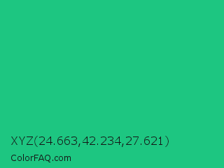 XYZ 24.663,42.234,27.621 Color is a normal green color and the nearest color is Mountain Meadow Crayola #1ab385. Hex code #1dc681 and RGB value is rgb(29,198,129). In RGB color space, this color is composed of 11% red, 78% green, 51% blue, In CMYK color space, this color is composed of 85% cyan, 0% magenta, 35% yellow , 22% black , In HSL color space, this color has a hue angle of 156° , 74% saturation and 45% lightness.