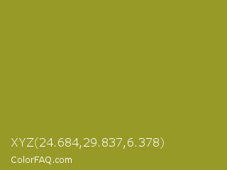 XYZ 24.684,29.837,6.378 Color is a normal yellow color and the nearest color is Citron #9fa91f. Hex code #979a27 and RGB value is rgb(151,154,39). In RGB color space, this color is composed of 59% red, 60% green, 15% blue, In CMYK color space, this color is composed of 2% cyan, 0% magenta, 75% yellow , 40% black , In HSL color space, this color has a hue angle of 62° , 60% saturation and 38% lightness.
