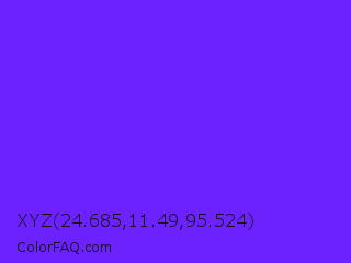 XYZ 24.685,11.49,95.524 Color is a normal indigo color and the nearest color is Han Purple #5218fa. Hex code #6b22ff and RGB value is rgb(107,34,255). In RGB color space, this color is composed of 42% red, 13% green, 100% blue, In CMYK color space, this color is composed of 58% cyan, 87% magenta, 0% yellow , 0% black , In HSL color space, this color has a hue angle of 260° , 100% saturation and 57% lightness.