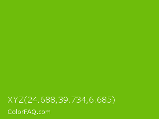 XYZ 24.688,39.734,6.685 Color is a normal green color and the nearest color is Lima #76bd17. Hex code #6ebd0b and RGB value is rgb(110,189,11). In RGB color space, this color is composed of 43% red, 74% green, 4% blue, In CMYK color space, this color is composed of 42% cyan, 0% magenta, 94% yellow , 26% black , In HSL color space, this color has a hue angle of 87° , 89% saturation and 39% lightness.
