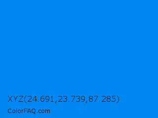 XYZ 24.691,23.739,87.285 Color is a normal blue color and the nearest color is Azure Radiance #007fff. Hex code #0087f2 and RGB value is rgb(0,135,242). In RGB color space, this color is composed of 0% red, 53% green, 95% blue, In CMYK color space, this color is composed of 100% cyan, 44% magenta, 0% yellow , 5% black , In HSL color space, this color has a hue angle of 207° , 100% saturation and 47% lightness.