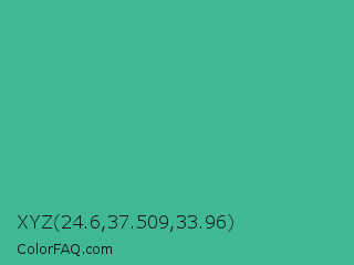XYZ 24.6,37.509,33.96 Color is a normal green color and the nearest color is Ocean Green #48bf91. Hex code #40b894 and RGB value is rgb(64,184,148). In RGB color space, this color is composed of 25% red, 72% green, 58% blue, In CMYK color space, this color is composed of 65% cyan, 0% magenta, 20% yellow , 28% black , In HSL color space, this color has a hue angle of 162° , 48% saturation and 49% lightness.