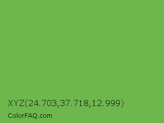 XYZ 24.703,37.718,12.999 Color is a normal green color and the nearest color is Bud Green #7bb661. Hex code #6eb74d and RGB value is rgb(110,183,77). In RGB color space, this color is composed of 43% red, 72% green, 30% blue, In CMYK color space, this color is composed of 40% cyan, 0% magenta, 58% yellow , 28% black , In HSL color space, this color has a hue angle of 101° , 42% saturation and 51% lightness.