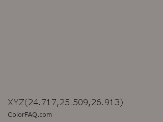 XYZ 24.717,25.509,26.913 Color is a normal red color and the nearest color is Taupe Gray #8b8589. Hex code #8f8988 and RGB value is rgb(143,137,136). In RGB color space, this color is composed of 56% red, 54% green, 53% blue, In CMYK color space, this color is composed of 0% cyan, 4% magenta, 5% yellow , 44% black , In HSL color space, this color has a hue angle of 9° , 3% saturation and 55% lightness.