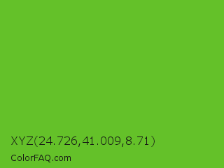 XYZ 24.726,41.009,8.71 Color is a normal green color and the nearest color is Green RYB #66b032. Hex code #64c129 and RGB value is rgb(100,193,41). In RGB color space, this color is composed of 39% red, 76% green, 16% blue, In CMYK color space, this color is composed of 48% cyan, 0% magenta, 79% yellow , 24% black , In HSL color space, this color has a hue angle of 97° , 65% saturation and 46% lightness.