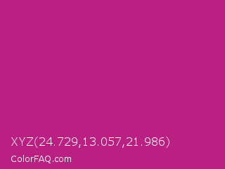 XYZ 24.729,13.057,21.986 Color is a normal magenta color and the nearest color is Magenta Dye #ca1f7b. Hex code #ba2081 and RGB value is rgb(186,32,129). In RGB color space, this color is composed of 73% red, 13% green, 51% blue, In CMYK color space, this color is composed of 0% cyan, 83% magenta, 31% yellow , 27% black , In HSL color space, this color has a hue angle of 322° , 71% saturation and 43% lightness.