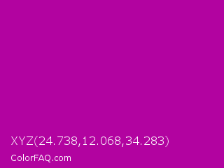 XYZ 24.738,12.068,34.283 Color is a normal magenta color and the nearest color is Heliotrope Magenta #aa00bb. Hex code #b203a0 and RGB value is rgb(178,3,160). In RGB color space, this color is composed of 70% red, 1% green, 63% blue, In CMYK color space, this color is composed of 0% cyan, 98% magenta, 10% yellow , 30% black , In HSL color space, this color has a hue angle of 306° , 97% saturation and 35% lightness.