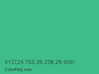 XYZ 24.763,39.258,29.939 Color is a normal green color and the nearest color is Mint #3eb489. Hex code #3fbd89 and RGB value is rgb(63,189,137). In RGB color space, this color is composed of 25% red, 74% green, 54% blue, In CMYK color space, this color is composed of 67% cyan, 0% magenta, 28% yellow , 26% black , In HSL color space, this color has a hue angle of 155° , 50% saturation and 49% lightness.