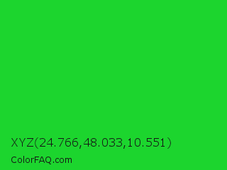 XYZ 24.766,48.033,10.551 Color is a normal green color and the nearest color is Lime Green #32cd32. Hex code #1cd52e and RGB value is rgb(28,213,46). In RGB color space, this color is composed of 11% red, 84% green, 18% blue, In CMYK color space, this color is composed of 87% cyan, 0% magenta, 78% yellow , 16% black , In HSL color space, this color has a hue angle of 126° , 77% saturation and 47% lightness.