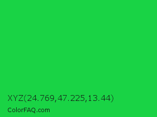 XYZ 24.769,47.225,13.44 Color is a normal green color and the nearest color is Malachite #0bda51. Hex code #19d345 and RGB value is rgb(25,211,69). In RGB color space, this color is composed of 10% red, 83% green, 27% blue, In CMYK color space, this color is composed of 88% cyan, 0% magenta, 67% yellow , 17% black , In HSL color space, this color has a hue angle of 134° , 79% saturation and 46% lightness.
