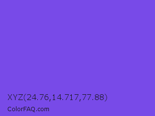 XYZ 24.76,14.717,77.88 Color is a normal indigo color and the nearest color is Majorelle Blue #6050dc. Hex code #784ae8 and RGB value is rgb(120,74,232). In RGB color space, this color is composed of 47% red, 29% green, 91% blue, In CMYK color space, this color is composed of 48% cyan, 68% magenta, 0% yellow , 9% black , In HSL color space, this color has a hue angle of 257° , 77% saturation and 60% lightness.