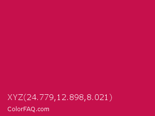 XYZ 24.779,12.898,8.021 Color is a normal rose color and the nearest color is Pictorial Carmine #c30b4e. Hex code #c6104c and RGB value is rgb(198,16,76). In RGB color space, this color is composed of 78% red, 6% green, 30% blue, In CMYK color space, this color is composed of 0% cyan, 92% magenta, 62% yellow , 22% black , In HSL color space, this color has a hue angle of 340° , 85% saturation and 42% lightness.