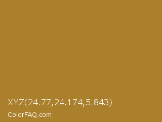 XYZ 24.77,24.174,5.843 Color is a normal orange color and the nearest color is Luxor Gold #a7882c. Hex code #aa802d and RGB value is rgb(170,128,45). In RGB color space, this color is composed of 67% red, 50% green, 18% blue, In CMYK color space, this color is composed of 0% cyan, 25% magenta, 74% yellow , 33% black , In HSL color space, this color has a hue angle of 40° , 58% saturation and 42% lightness.