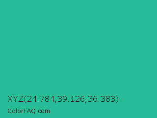 XYZ 24.784,39.126,36.383 Color is a normal cyan color and the nearest color is Mountain Meadow #30ba8f. Hex code #27bd99 and RGB value is rgb(39,189,153). In RGB color space, this color is composed of 15% red, 74% green, 60% blue, In CMYK color space, this color is composed of 79% cyan, 0% magenta, 19% yellow , 26% black , In HSL color space, this color has a hue angle of 166° , 66% saturation and 45% lightness.