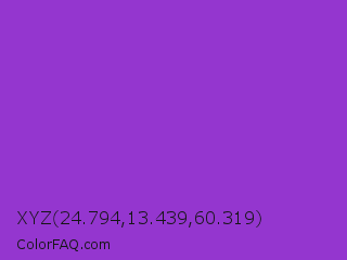 XYZ 24.794,13.439,60.319 Color is a normal purple color and the nearest color is Dark Orchid #9932cc. Hex code #9436cf and RGB value is rgb(148,54,207). In RGB color space, this color is composed of 58% red, 21% green, 81% blue, In CMYK color space, this color is composed of 29% cyan, 74% magenta, 0% yellow , 19% black , In HSL color space, this color has a hue angle of 277° , 61% saturation and 51% lightness.