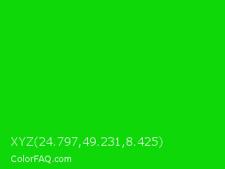 XYZ 24.797,49.231,8.425 Color is a normal green color and the nearest color is Green #00ff00. Hex code #0fd808 and RGB value is rgb(15,216,8). In RGB color space, this color is composed of 6% red, 85% green, 3% blue, In CMYK color space, this color is composed of 93% cyan, 0% magenta, 96% yellow , 15% black , In HSL color space, this color has a hue angle of 118° , 93% saturation and 44% lightness.