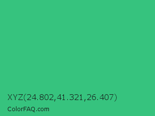 XYZ 24.802,41.321,26.407 Color is a normal green color and the nearest color is UFO Green #3cd070. Hex code #36c37e and RGB value is rgb(54,195,126). In RGB color space, this color is composed of 21% red, 76% green, 49% blue, In CMYK color space, this color is composed of 72% cyan, 0% magenta, 35% yellow , 24% black , In HSL color space, this color has a hue angle of 151° , 57% saturation and 49% lightness.