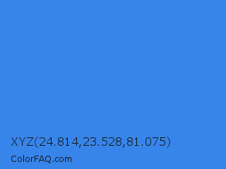 XYZ 24.814,23.528,81.075 Color is a normal blue color and the nearest color is Bleu De France #318ce7. Hex code #3785ea and RGB value is rgb(55,133,234). In RGB color space, this color is composed of 22% red, 52% green, 92% blue, In CMYK color space, this color is composed of 76% cyan, 43% magenta, 0% yellow , 8% black , In HSL color space, this color has a hue angle of 214° , 81% saturation and 57% lightness.
