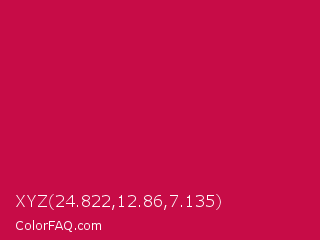 XYZ 24.822,12.86,7.135 Color is a normal rose color and the nearest color is Pictorial Carmine #c30b4e. Hex code #c70c47 and RGB value is rgb(199,12,71). In RGB color space, this color is composed of 78% red, 5% green, 28% blue, In CMYK color space, this color is composed of 0% cyan, 94% magenta, 64% yellow , 22% black , In HSL color space, this color has a hue angle of 341° , 89% saturation and 41% lightness.