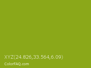 XYZ 24.826,33.564,6.09 Color is a normal lime color and the nearest color is Citron #9fa91f. Hex code #8ba819 and RGB value is rgb(139,168,25). In RGB color space, this color is composed of 55% red, 66% green, 10% blue, In CMYK color space, this color is composed of 17% cyan, 0% magenta, 85% yellow , 34% black , In HSL color space, this color has a hue angle of 72° , 74% saturation and 38% lightness.