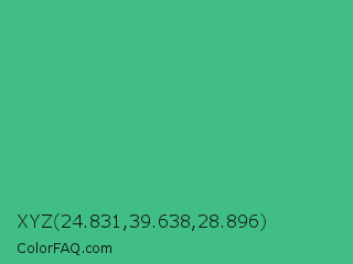 XYZ 24.831,39.638,28.896 Color is a normal green color and the nearest color is Mint #3eb489. Hex code #40be86 and RGB value is rgb(64,190,134). In RGB color space, this color is composed of 25% red, 75% green, 53% blue, In CMYK color space, this color is composed of 66% cyan, 0% magenta, 29% yellow , 25% black , In HSL color space, this color has a hue angle of 153° , 50% saturation and 50% lightness.