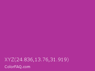 XYZ 24.836,13.76,31.919 Color is a normal magenta color and the nearest color is Byzantine #bd33a4. Hex code #b0319a and RGB value is rgb(176,49,154). In RGB color space, this color is composed of 69% red, 19% green, 60% blue, In CMYK color space, this color is composed of 0% cyan, 72% magenta, 13% yellow , 31% black , In HSL color space, this color has a hue angle of 310° , 56% saturation and 44% lightness.
